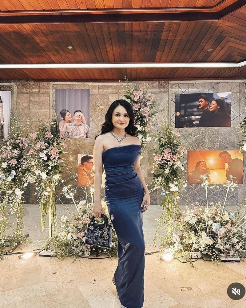 Kakak dari Russel Ziudith ini terlihat elegan dengan strapless dress berwarna deep navy saat datang ke acara pernikahan kerabatnya. Lehernya dihias dengan kalung yang mewah.
