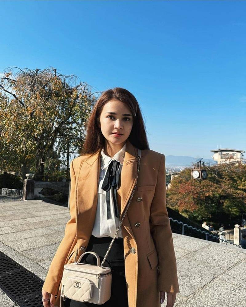 Ia juga terlihat mengenakan jaket blazer berwarna cokelat yang memberikan kesan fancy. Sedangkan sling bag Gucci pun menjadi penyempurna outfitnya.