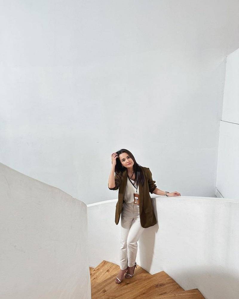 Michelle mengenakan high waist trouser berwarna off white dan atasan berwarna senada.