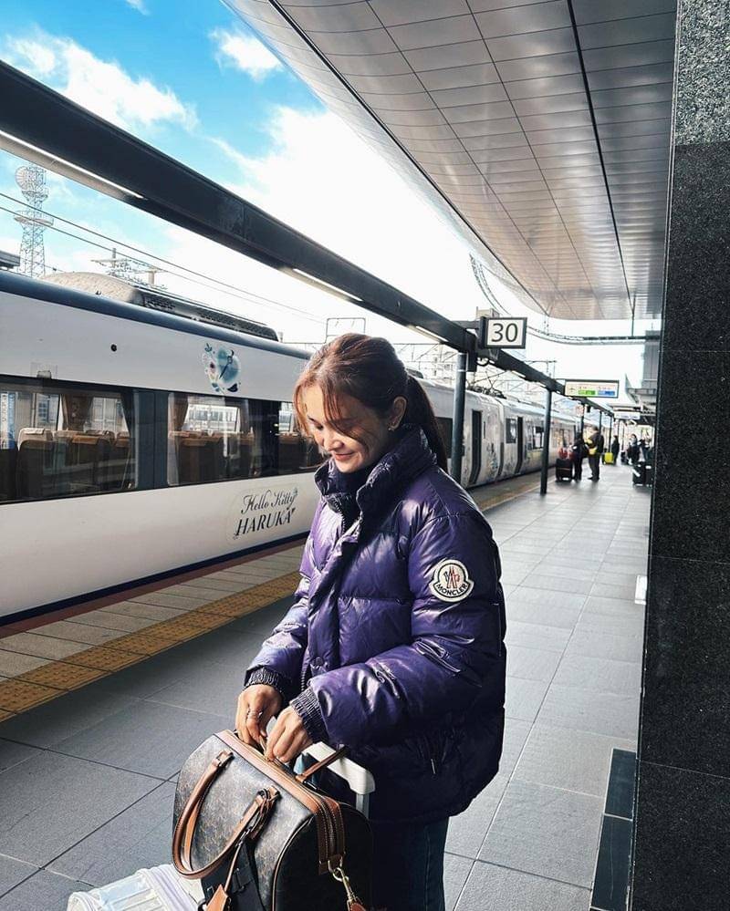 Kembali saat dirinya sedang traveling, perempuan blasteran Indonesia, Jepang, dan Belanda ini terlihat mengenakan puffy jacket berwarna ungu.