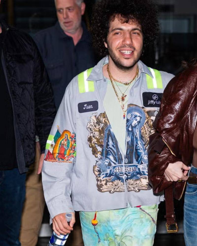 Kemeja rajut hijaunya dipadukan dengan jaket abu-abu beritsleting yang dihiasi logo Jiffy Lube dan gambar-gambar religius. Ia melengkapi pakaiannya dengan rantai emas dan sepatu bot hitam.