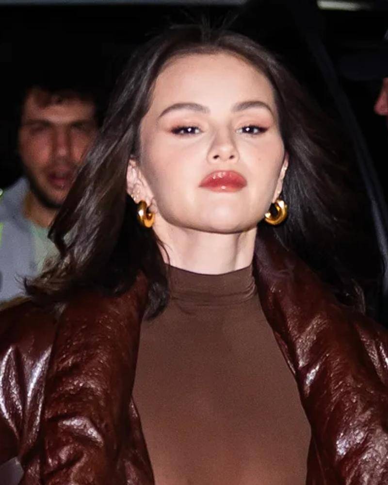 Gomez memilih tampilan yang santai namun berkelas, memadukan jaket kulit merah anggur mengilap dengan atasan cokelat tembus pandang. Ia melengkapi penampilannya dengan tas bucket Saint Laurent, yang ideal untuk membawa perlengkapan kecantikan penting.