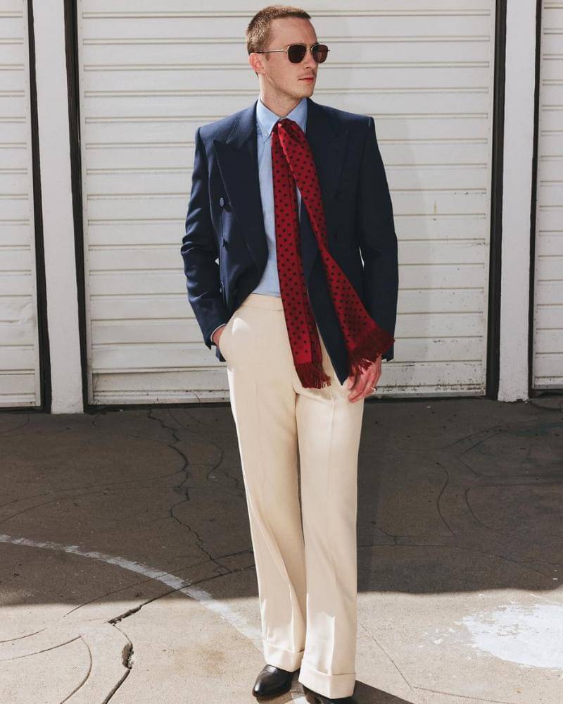 Drew Starkey, bintang "Outer Banks", turut menghadiri SAG Awards 2025, dengan mengenakan pakaian bergaya preppy yang terinspirasi dari kampus. Pakaiannya terdiri dari blazer wol gabardine berkancing ganda, berwarna biru tua dengan kerah runcing, celana panjang wol berwarna krem dengan lipatan di depan dan manset lebar, serta kemeja biru muda.