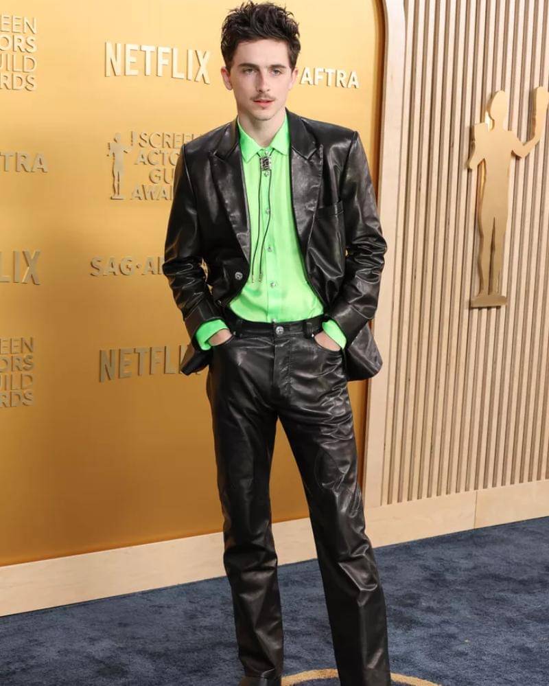 Untuk acara malam ini, Chalamet menciptakan kembali tampilan vintage Bob Dylan, yang menampilkan kemeja hijau limau, dasi bolo, dan jaket hitam. Pemeran " Wonka" ini, meminta versinya dibuat khusus oleh Chrome Hearts, lengkap dengan dasi bolo Cartier.