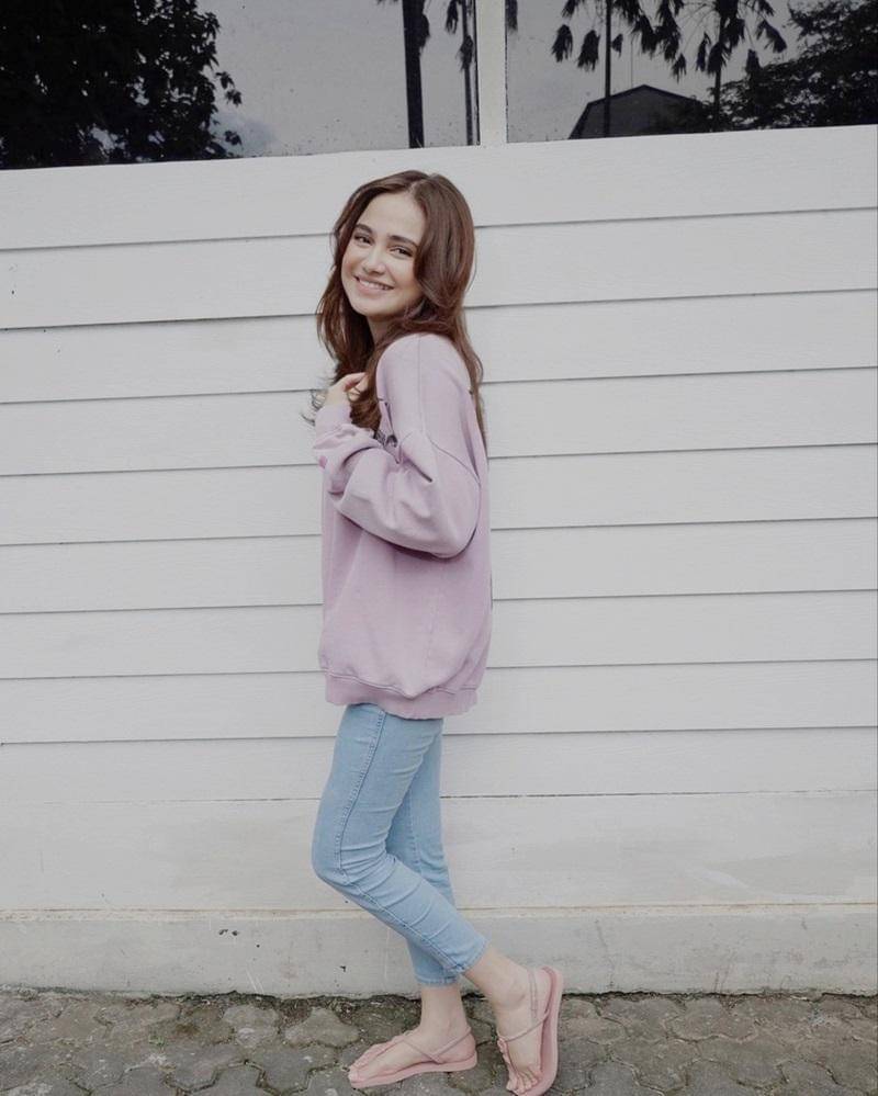 Dengan rambut tergerai, sweater berwarna pastel, dan jeans denim, Syifa terlihat begitu segar dan santai. Wajahnya yang hanya dipulas makeup tipis memberikan kesan yang fresh.