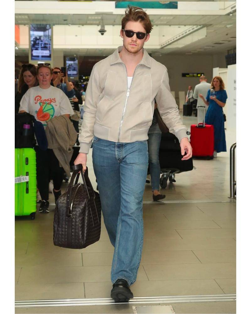 Di sini, Joe mengenakan jaket berwarna krem, yang membuat kulitnya tampak bersinar. Ia memadukannya dengan sepasang jeans biru, dan sepatu hitam.