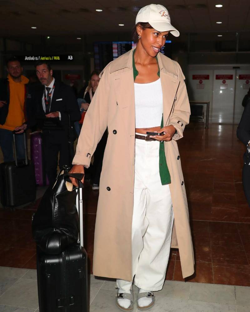 Model dan aktris berdarah Somalia-Kanada, Sabrina Elba memberikan tampilan yang menunjukkan kenyamanan dan stylish pada looknya kali ini. Ia tiba di bandara menggunakan atasan berwarna putih, yang dilapisi kemeja berwarna hijau, dipadukan dengan long coat berwarna cokelat muda, serta celana kain berwarna putih.