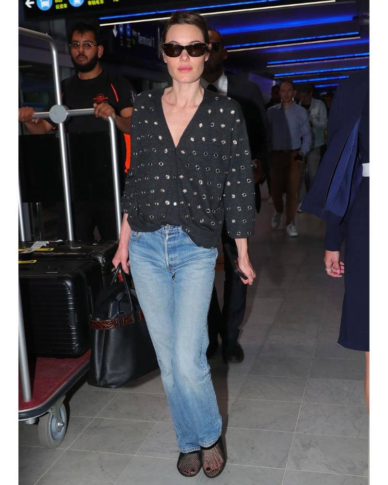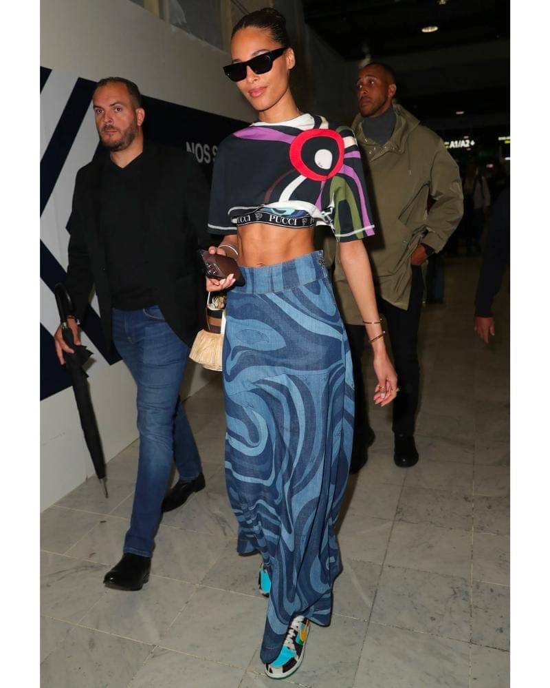 Sebagai seorang model, dirinya harus terlihat fashionable. Seperti busananya ketinggal berada di bandara Cannes. Ia mengenakan cropped top berwarna dasar hitam, dengan motif berwarna-warni. Ia memadukan atasannya dengan rok highwaist panjang dengan motif pusaran.