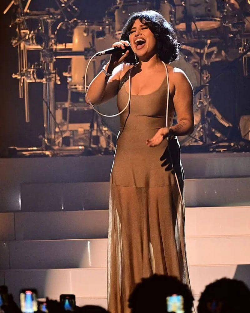 Raye sukses mencuri perhatian di panggung MTV EMAs 2024 dengan penampilannya yang memukau. Dirinya tampil anggun mengenakan sleeveless dress berwarna nude yang elegan. Detail sheer di bagian bawah gaun memperlihatkan lekuk tubuhnya dengan sempurna. Penampilannya semakin cantik dengan rambut pendek bergelombang dan hiasan tangan yang mewah.