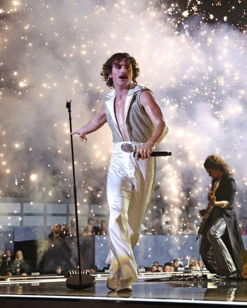Benson Boone tampil mencolok dengan outfit serba putih yang berani di MTV EMAs 2024. Rompi berkilauan yang memperlihatkan dadanya memberikan kesan percaya diri dan glamor.
