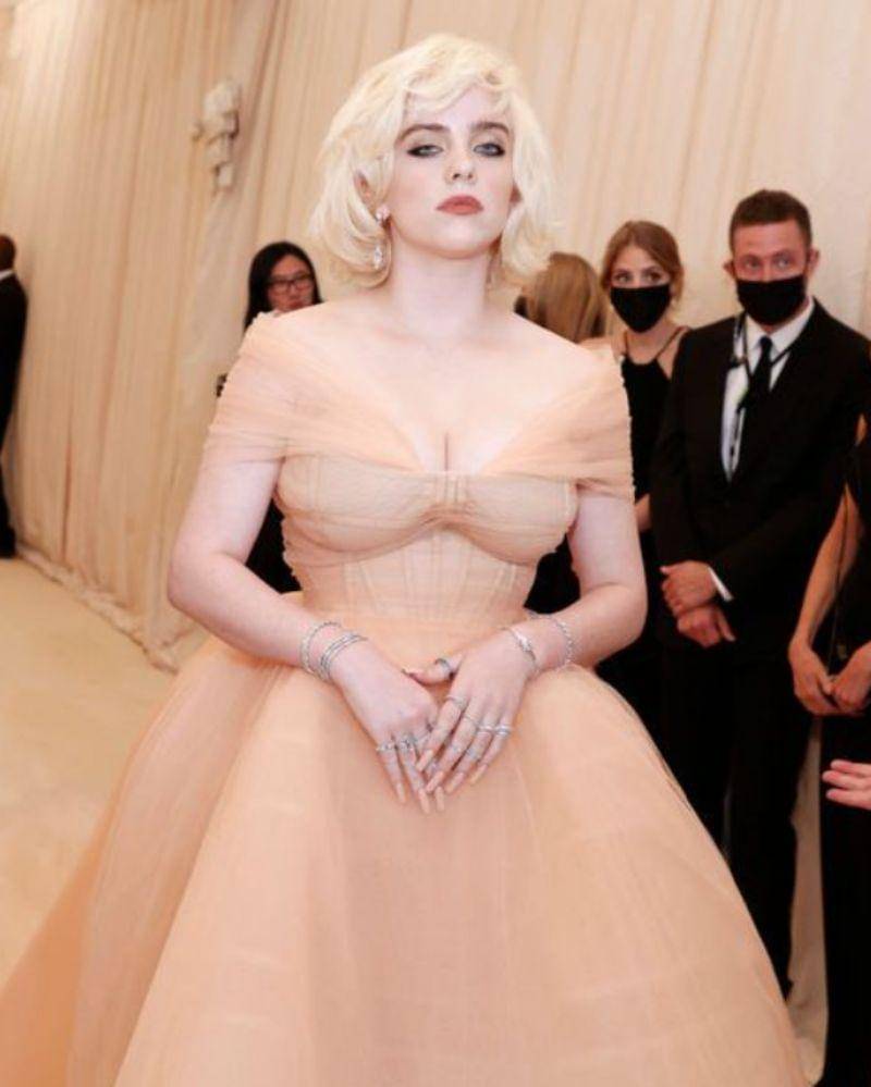 Selanjutnya, ada artis sekaligus penyanyi multitalenta Billie Eilish yang menggunakan gaun berwarna peach rancangan Oscar De La Renta pada acara red carpet Met Gala 2021.