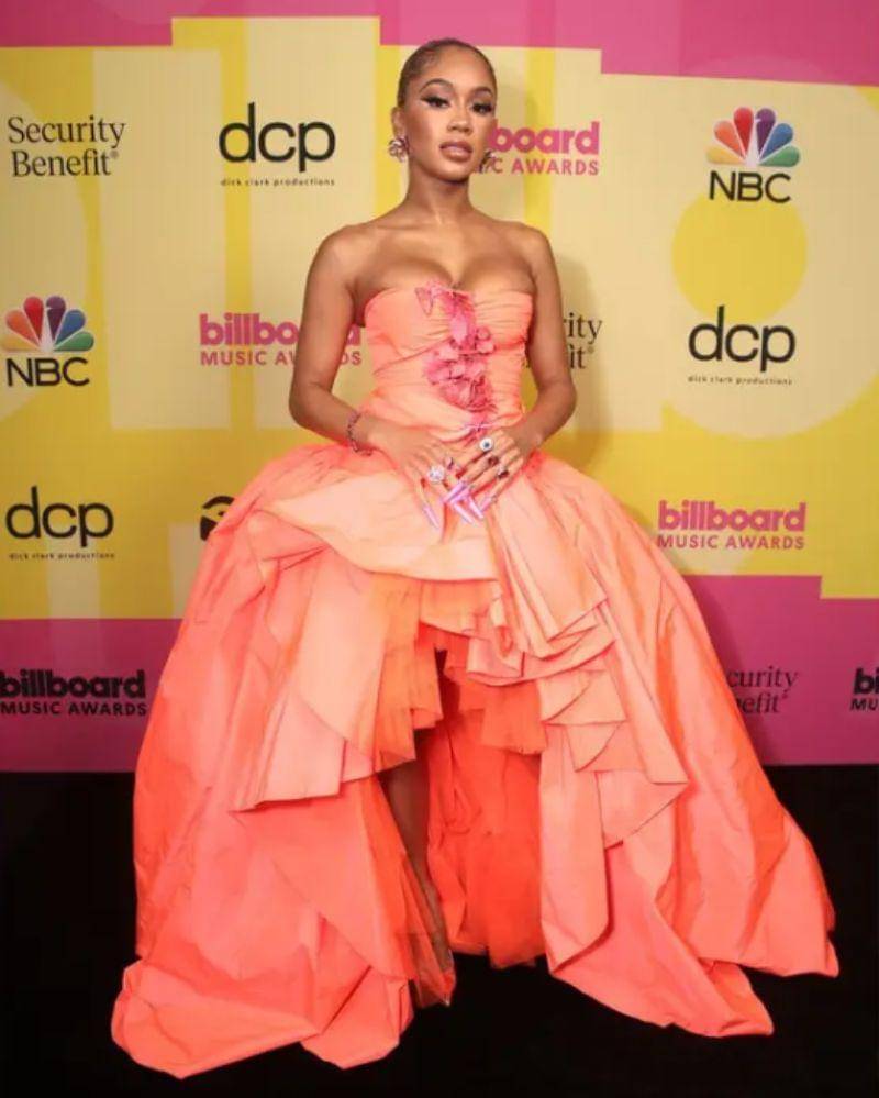 Selanjutnya, ada penyanyi sekaligus rapper Saweetie yang tampil girly di red carpet Billboard Music Awards 2021, uniknya, model dress peach nya saat itu berbentuk kelopak bunga karena memiliki potongan yang tidak simetris.