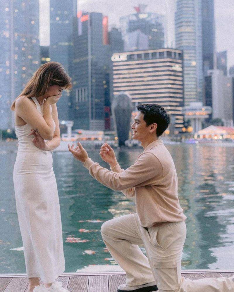 Cassandra Lee dan Ryuken Lie mengabadikan lamaran mereka di Marina Bay Sands, Singapura, sebelum pernikahan mereka di bulan Agustus lalu. Cassandra tampil memesona dalam gaun ketat berlapiskan vest simpel yang memperlihatkan lekuk tubuhnya dengan anggun.