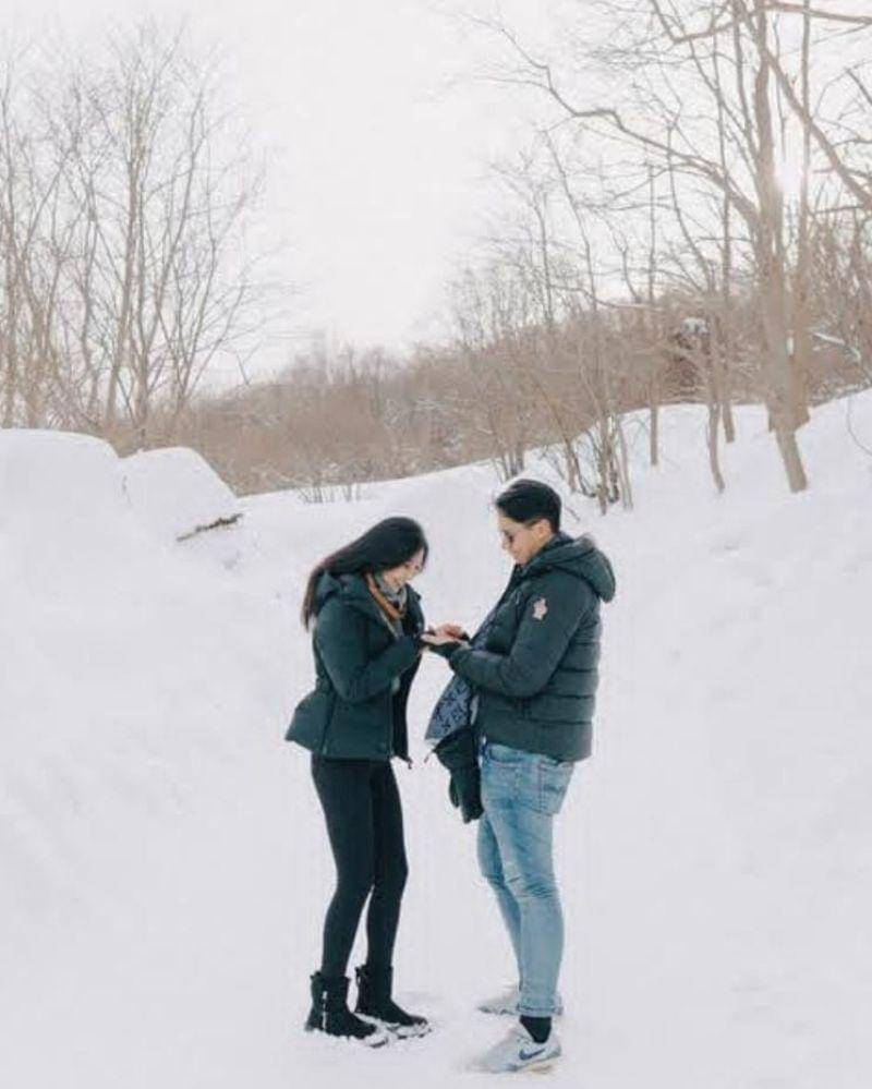 Pasangannya melengkapi momen ini dengan jaket biru yang dikombinasikan dengan jeans biru muda, menciptakan kontras yang menarik di antara putihnya salju. Pemandangan musim dingin Jepang menjadi latar belakang sempurna untuk awal baru mereka.