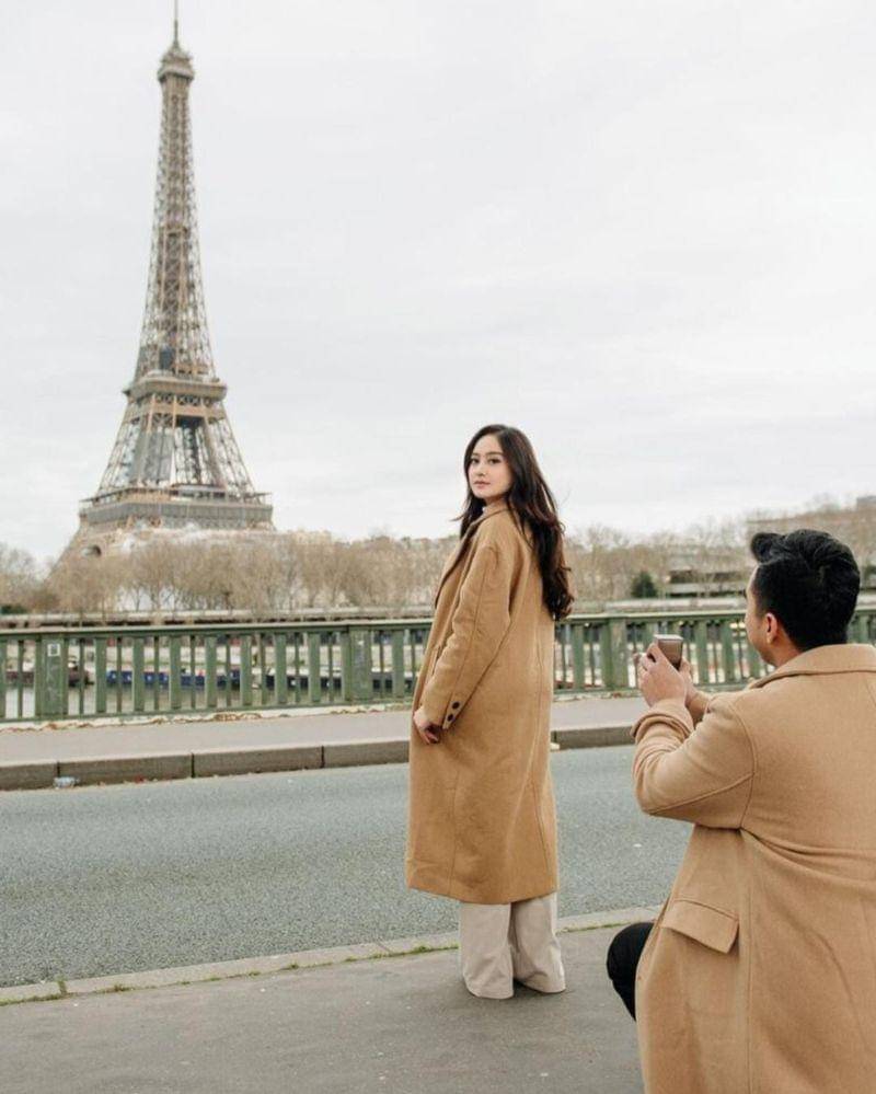 dan elegan dalam balutan jas panjang berwarna cokelat yang dipadukan dengan celana gelap. Kerah jas yang mereka kenakan menambah kesan formal namun tetap romantis, sekaligus latar belakang ikonik kota Paris yang menambah pesona momen spesial mereka.
