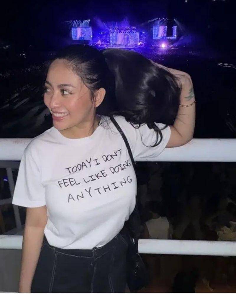Rachel Vennya mengenakan lirik dari lagu "The Lazy Song" yang ikonik. Ia menguncir rambutnya ponytail dan mengenakan bawahan berwarna hitam.