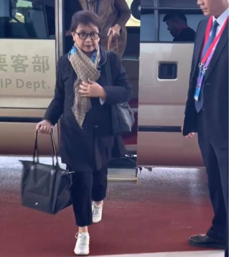 Dengan tambahan aksesoris syal yang dilingkarkan pada lehernya, Retno Marsudi berhasil menambahkan kesan yang anggun dan gaya professional.