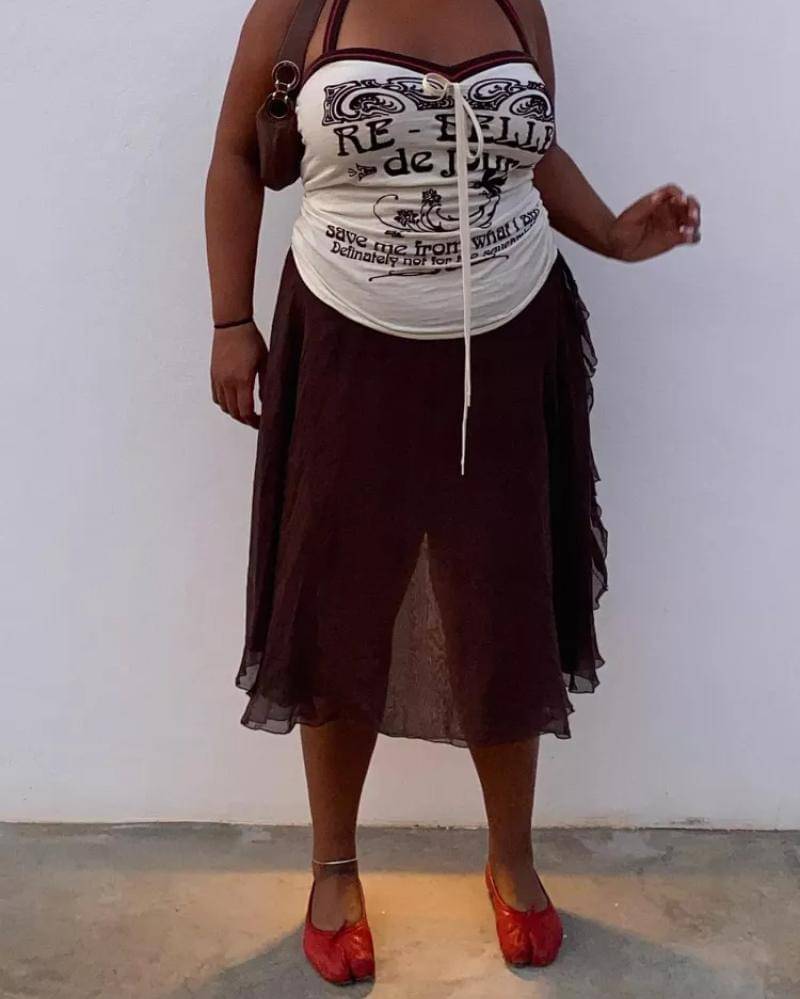 Seperti gaya yang satu ini, rok cokelat tua dipadukan dengan atasan putih chic menghasilkan pakaian musim panas yang bergaya dan sederhana. Tambahkan semburat warna dengan sepatu flats merah yang menggemaskan.