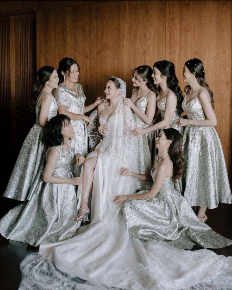 Kilau silver pada setiap gaun menciptakan tampilan glamor yang seimbang dengan nuansa modern dan simpel. Detail perhiasan minimalis yang dikenakan para bridesmaid menambah kesan chic tanpa mengalihkan fokus dari keindahan gaun.