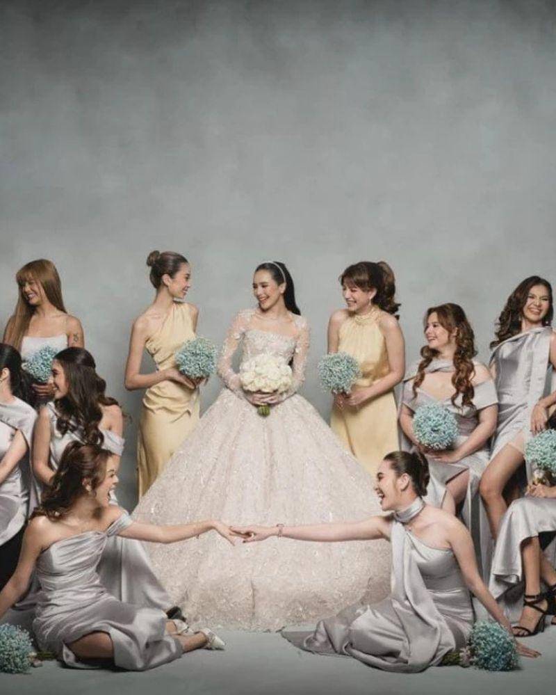 Para bridesmaid Beby Tshabina mengenakan gaun abu-abu muda yang dirancang dengan gaya modern dan elegan. Model gaun bervariasi namun tetap seragam, hingga dapat memberikan kesan dinamis yang menyatu harmonis dengan gaun pengantin.