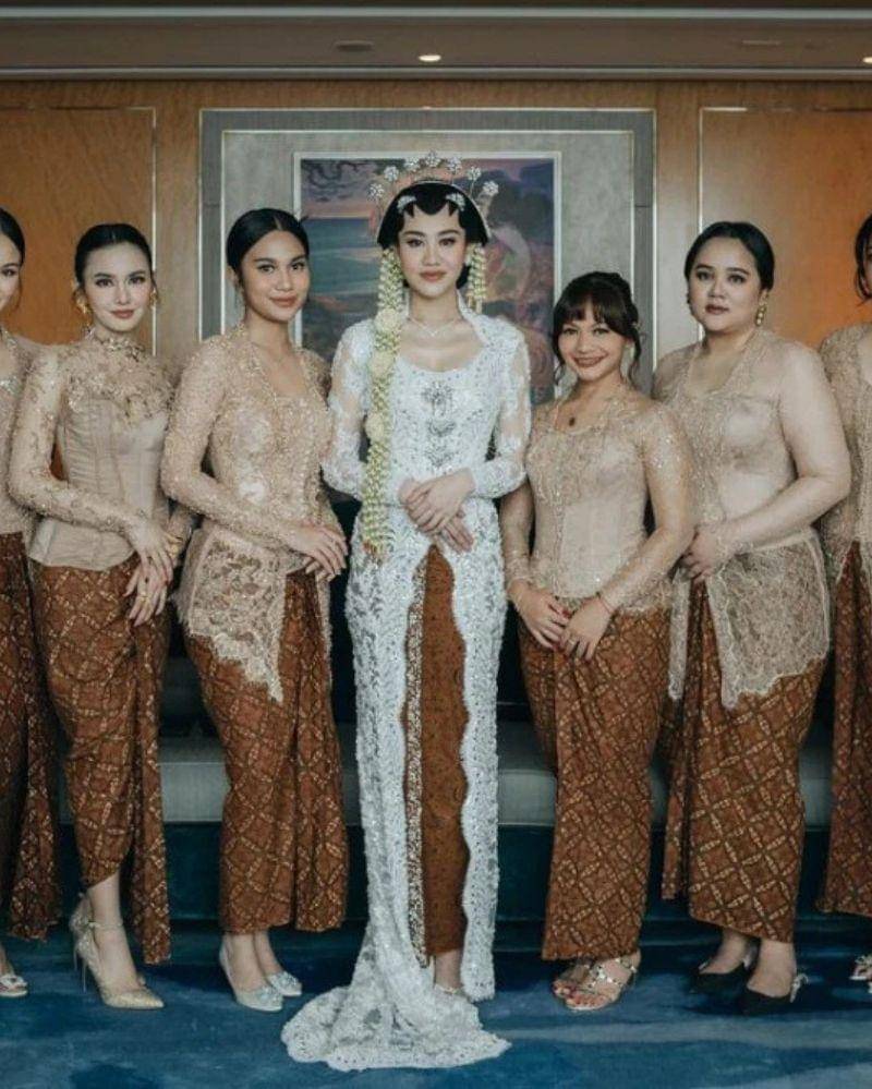 Para bridesmaid Jessica Mila tampil dengan kebaya klasik modern beige muda berbahan brokat bermotif cantik. Potongan yang mengikuti bentuk tubuh menciptakan penampilan anggun dengan variasi desain yang tetap serasi. Kombinasi rok batik cokelat dengan motif tradisional memberikan sentuhan formal yang elegan. Keseluruhan tampilan mencerminkan keserasian yang sempurna untuk acara adat pernikahan.