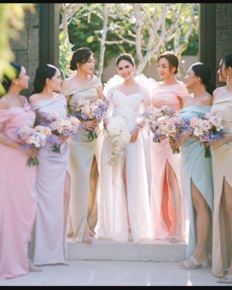 Para bridesmaid Mahalini memukau dengan balutan gaun satin ungu lilac yang elegan. Setiap gaun hadir dengan desain unik, mulai dari potongan shoulder-off hingga one-shoulder yang memberikan sentuhan individualitas modern.