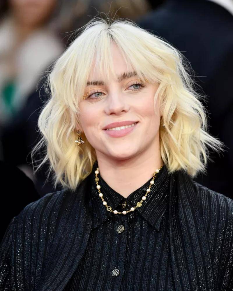 Ingat gaya Billie Eilish yang ikonik ini? Untuk Mama pemilik rambut tipis, kamu bisa mendapatkan tampilan yang lebih penuh dan bervolume dengan meniru gaya rambut bob pirang berlapis milik Billie Eilish, yang menampilkan ikal lembut dan poni tipis.