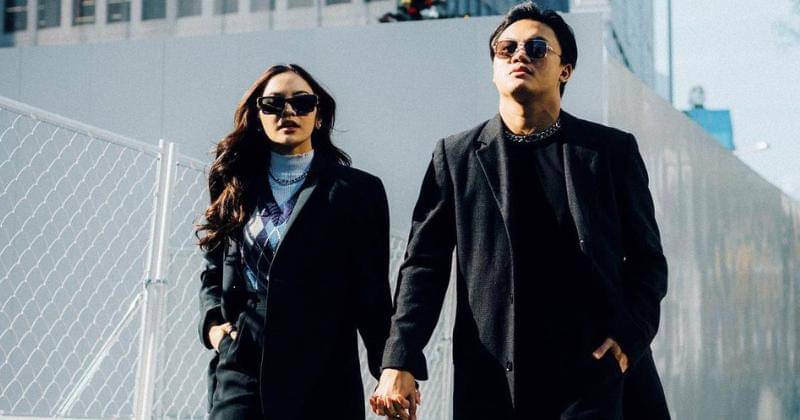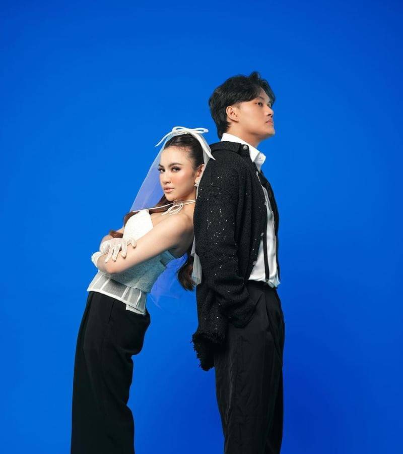 Rizky Febian terlihat mengenakan jaket zipper berwarna hitam yang dipadukan dengan dalaman kaus hitam, sedangkan Mahalini terlihat mengenakan kemeja dengan dalaman crop top hitam.