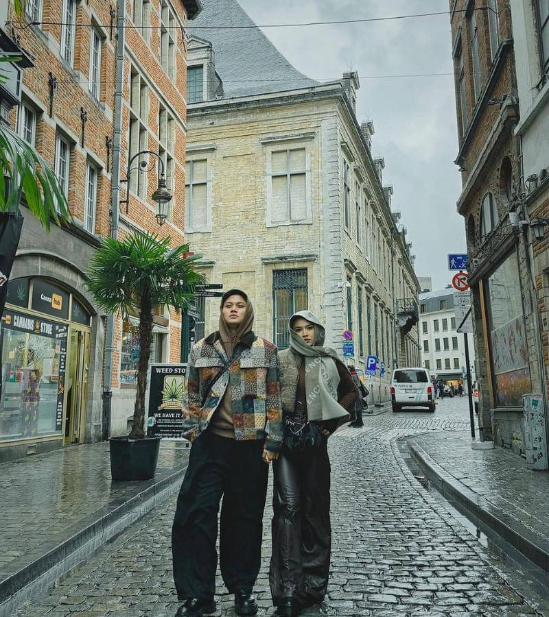 Potret kebersamaan Rizky Febian dan Mahalini ketika berlibur di Belgia yang memiliki cuaca dingin, membuat keduanya harus mengenakan pakaian tebal lengkap dengan penutup kepala.