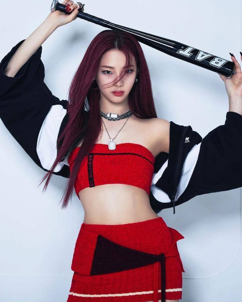 Nah, di Visual Photo, Pharita turut tampil menawan. Dirinya memakai atasan crop top berwarna dominan merah dan hitam, serta mini skirt berwarna hitam, dengan detail ritsleting dan saku di bagian samping. Serta, sepatu platform tinggi ala boots, berwarna merah, dengan detail straps.