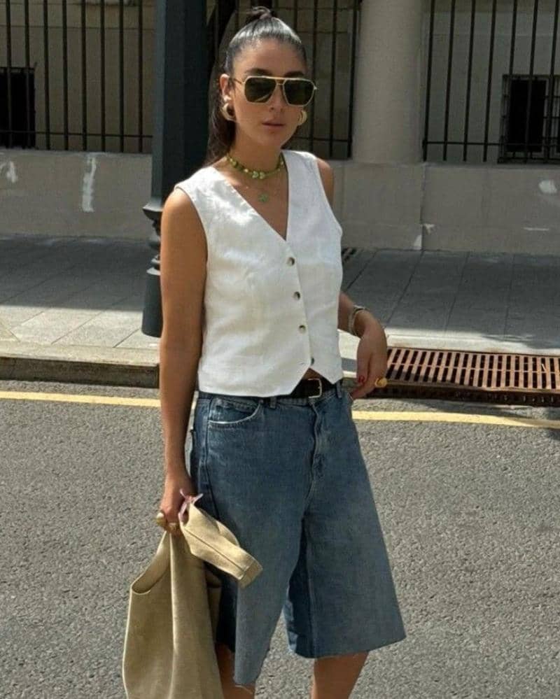 Para fashion influencer memadukannya dengan sepatu boot tinggi di atas lutut untuk tampilan yang anggun dan berbeda. Bahkan, tren ini sempat ditampilkan di satu peragaan busana untuk musim gugur 2024. Seorang model terlihat memadukan celana pendek denim dengan sepatu bot, tank top bergaris, dan jaket pendek yang bergaya. Kamu juga bisa memadukannya dengan vest sambil memasukkan gaya khas Mama sendiri.