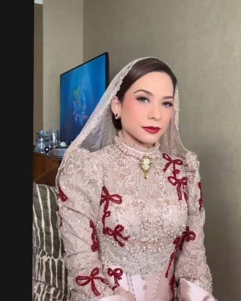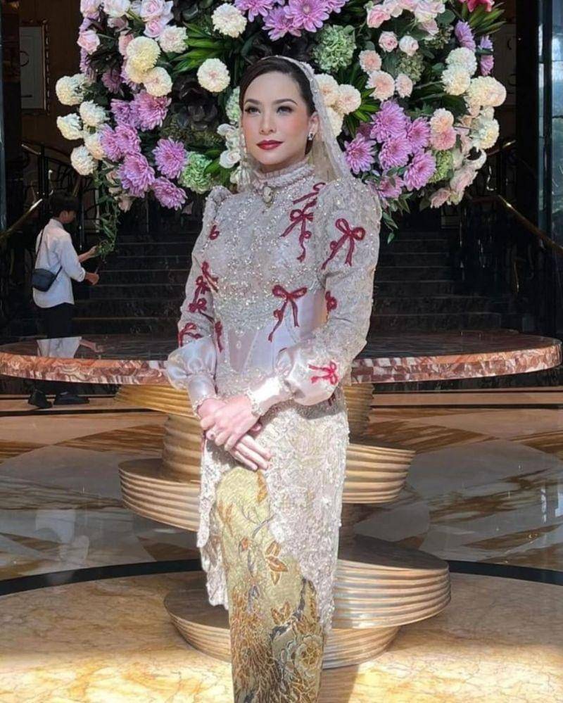 Rachel memilih kebaya warna nude dengan aksen pita merah di lengan dan badan, hingga menciptakan kontras yang elegan.