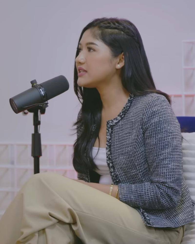 Gaya Erina yang pertama menunjukkan dirinya mengenakan dalaman berwarna putih dengan outer berupa blazer tweed dan bawahan celana kain berwarna krem. Bahan tweed pada outer yang Erina gunakan menjadi salah satu bahan yang bisa banget kamu pakai ke kantor.