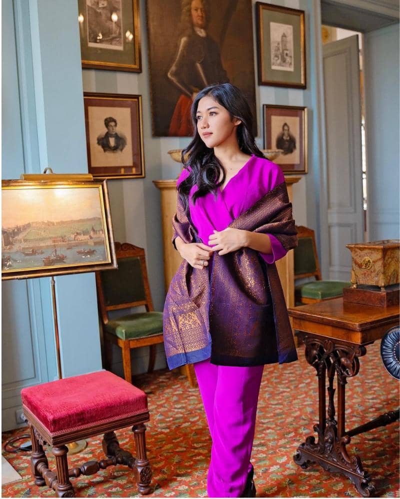 Erina mengenakan jumpsuit berwarna ungu dengan lengan baju yang cukup panjang. Memberikan gaya pakaian yang sopan dan cocok untuk bekerja. Jika, ingin terlihat lebih sederhana, Mama bisa saja mengenakan jumpsuit dengan gaya yang sama seperti Erina, tanpa menggunakan kain.