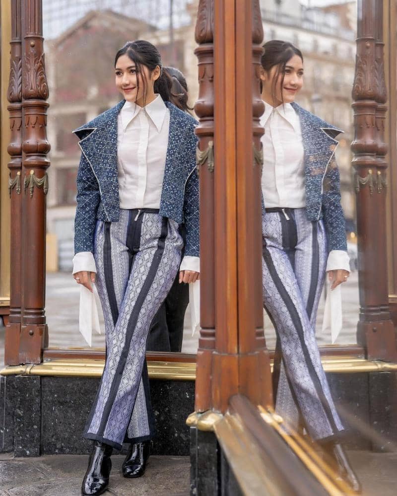 Erina memadupadankan kemeja putih berkerah tajam dengan blazer bercorak batik Gedog dan celana yang menggunakan kain tenun songket Halaban Sumatera Barat. Paduan warna biru yang berbeda dan motif yang ramai uniknya tidak terlihat bertabrakan, melainkan saling melengkapi.