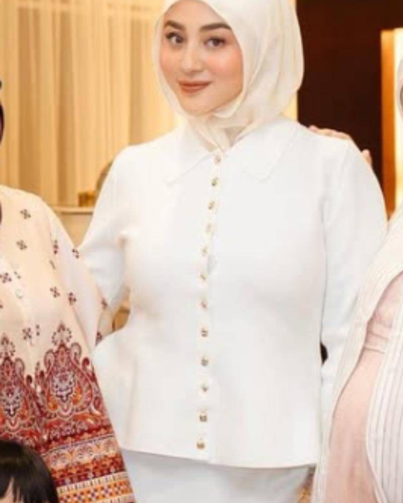 Untuk bawahan, ia memilih mengenakan rok panjang berwarna putih-perak, dengan bahan yang berkilau. Rok tersebut terlihat flowy sekaligus memberikan tampilan elegan. Untuk melengkapi tampilannya, istri Ali Syakieb ini memilih memakai hijab krem tipis, yang memiliki ciput dibawahnya untuk tetap menjaga aurat.