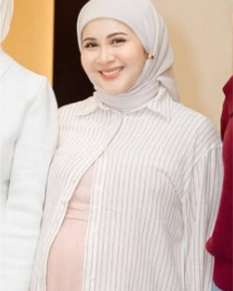 Kesha Ratuliu yang tengah mengandung buah hatinya tampil stylish dalam balutan dress panjang berwarna pink. Ia turut memadukannya dengan kemeja bergaris-garis berwarna netral.
