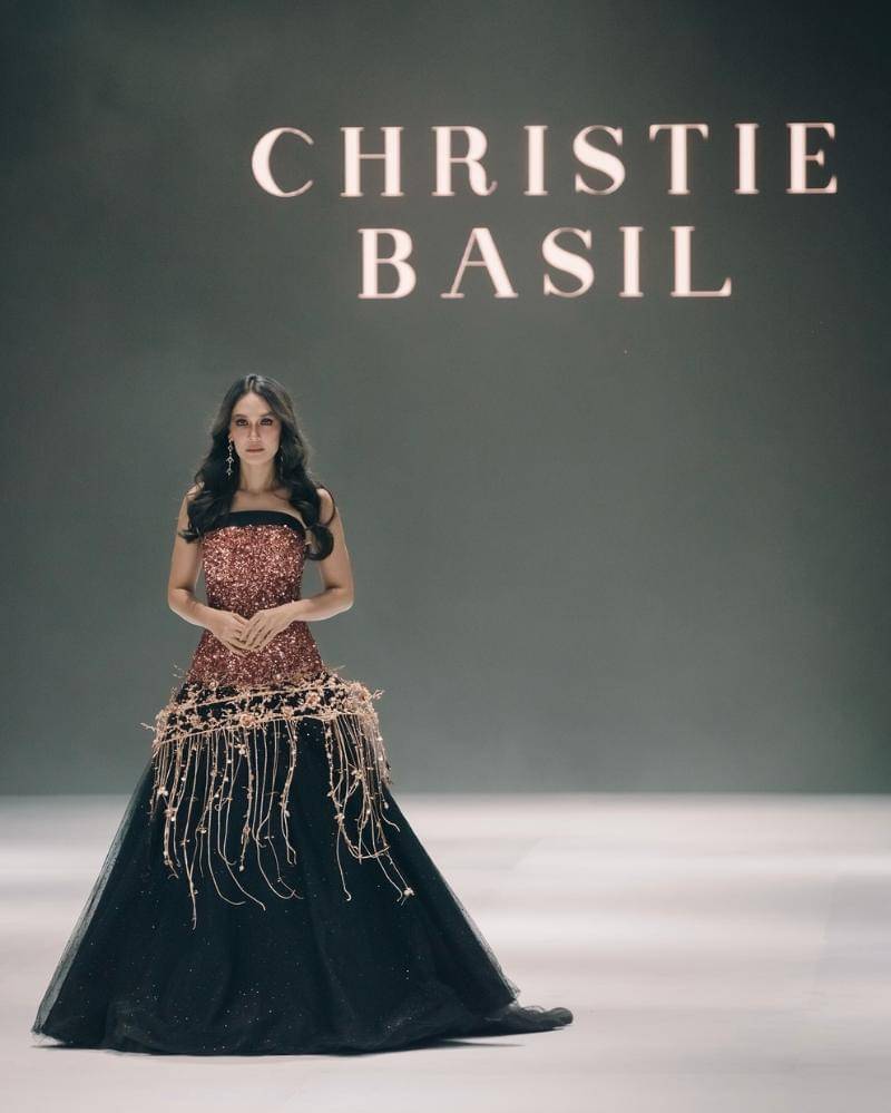 Gaun pertama yang dikenakan Luna Maya, hasil karya desainer Christie Basil, berhasil menonjolkan kesan dramatis dan glamor.