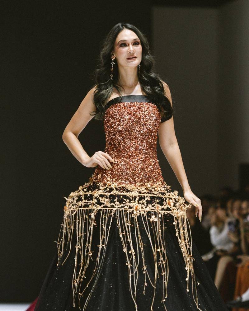 Penampilan Luna Maya dalam gaun ini memadukan elemen artistik yang memukau, menciptakan momen yang mengesankan saat ia melangkah dengan anggun di atas catwalk.