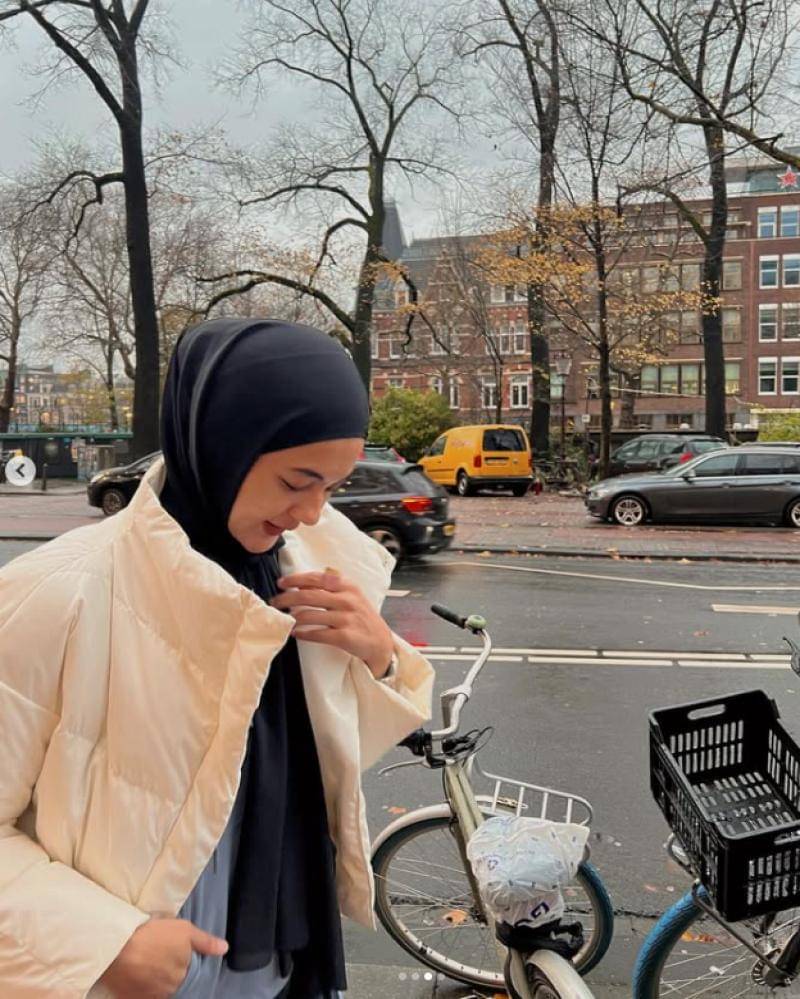 Saat jalan-jalan ke Belanda, Paula terlihat mengenakan jaket windbreaker yang tebal. Jaket berwarna putih itu dipadukan dengan pashmina instan berwarna putih.