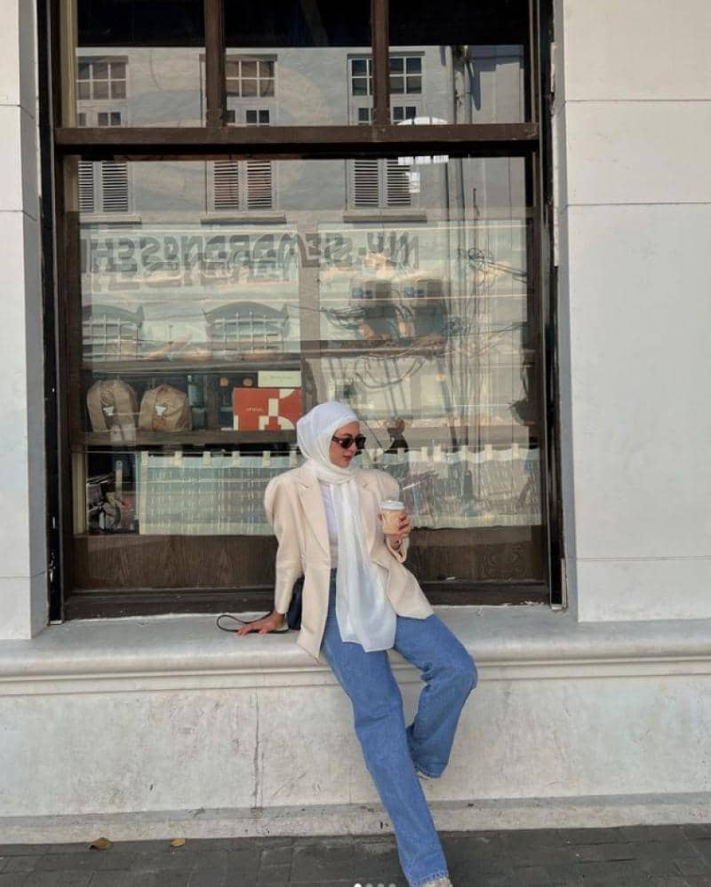 Ia menyempurnakan outfitnya dengan memilih pashmina berwarna putih dan kacamata hitam.