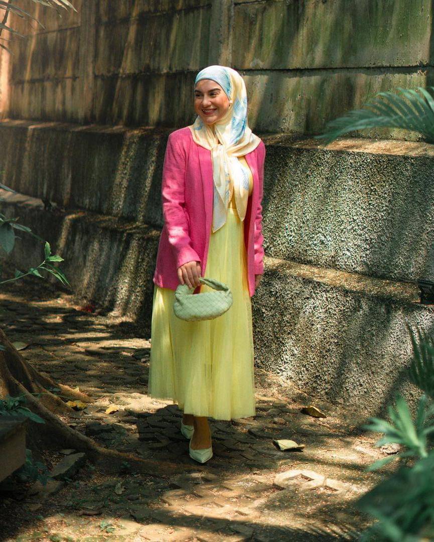 Hijab segi empat bermodel ikat yang dikenakannya tampak menyatu dengan gaun dan polesan make up. Meski menggelar acara di luar ruangan, pilihan warna dari gaun yang dikenakannya tampak pas dan tidak berlebihan.