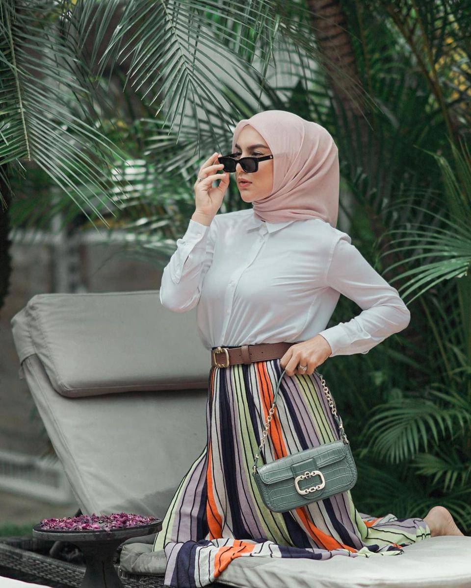 Ikat pinggang putih yang dikenakannya mampu membuat penampilannya semakin modis sekaligus trendi. Alih-alih memakai segi empat seperti biasanya, kali ini Irish Bella lebih memilih pashmina berwarna netral.