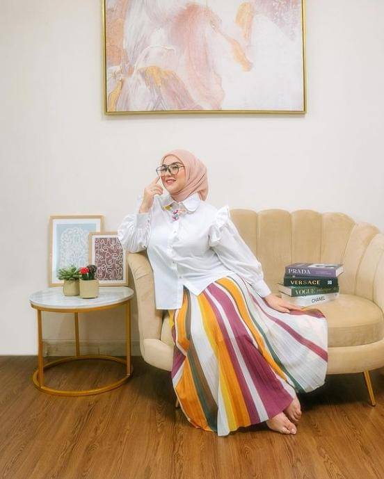 Busana bernunsa colorful memang terlihat menarik ketika dipakai. Kali ini, perempuan keturunan Belgia itu memakai kemeja putih dan memadukannya bersama rok plisket berwarna-warni.