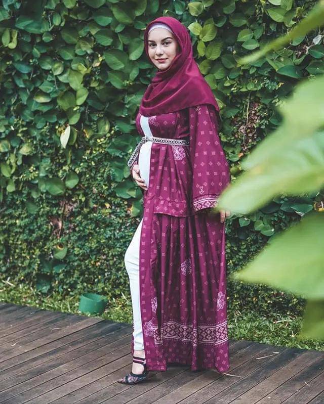 Irish Bella tampil modis mengenakan burgundy long outer bercorak etnik berbahan viola. Kerudung satin berwarna serupa menjadi pilihan tepat. Agar tidak membuat perutnya sesak, Ibel tampak mengenakan belt tepat di atas bagian baby bump.