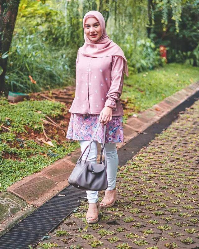 5. Memakai blouse pink yang mempunyai motif totol dan bunga