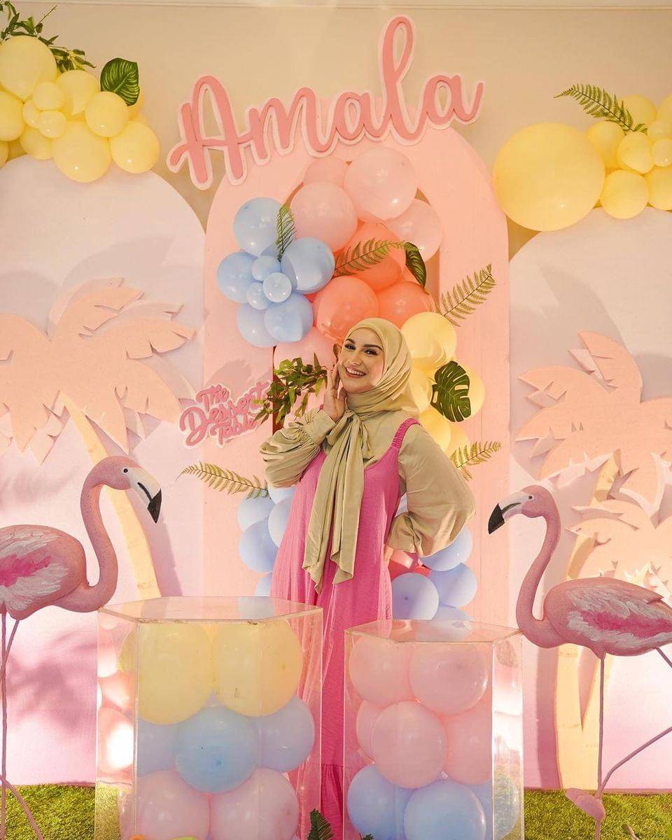 Irish Bella kembali tampil menonjol dengan busana berwarna cerah saat ulang tahun anak keduanya, Amala. Mengingat dekorasi pesta ulang tahun didominasi dengan warna pink, akhirnya membuat Irish Bella memilih untuk memakai jumpsuit berwarna hot pink.