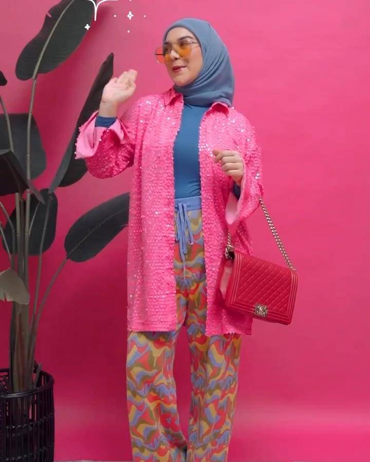 Dalam salah satu outfit yang diperlihatkan, ia tampak mengenakan kaus panjang berwarna biru kemudian dibalut outer panjang pink yang dihiasi glitter pada beberapa bagiannya. Celana bermotif abstrak warna-warni mampu menyempurnakan penampilannya.