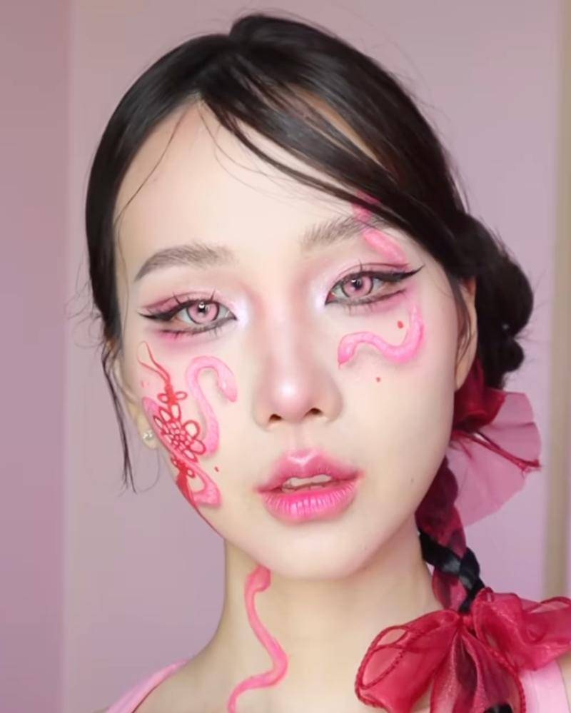 Buatlah gambar ular melintasi beberapa bagian wajah, lengkap dengan hiasan khas Imlek. Gaya yang satu ini pastinya tidak akan menakutkan, melainkan menimbulkan kesan kemeriahan dan seru. Lengkapi dengan bibir matte pink dengan sedikit kilau.
