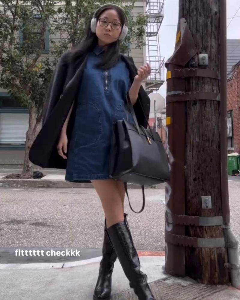 Selain itu, ia melapisi dress dengan blazer hitam yang serasi dengan high knee boots dan tas kantornya.